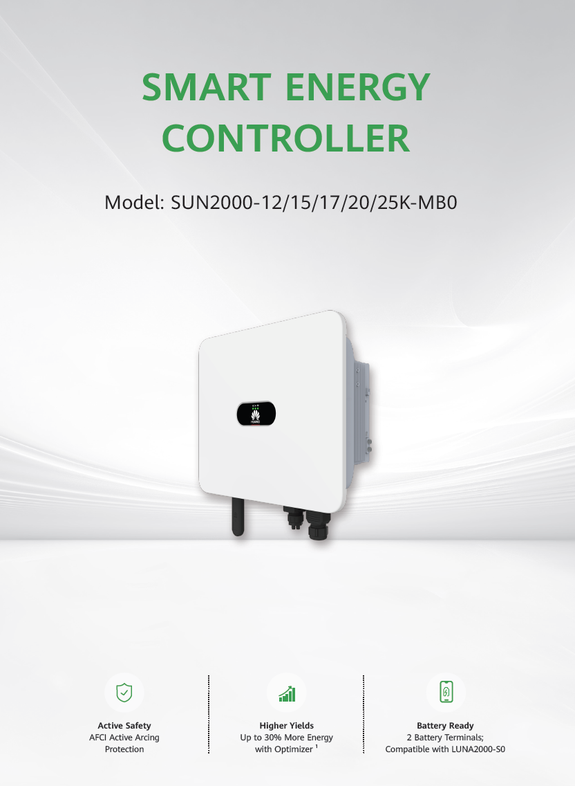 Huawei SUN2000-20K-MB0 on 3-faasiline asümmeetriline hübriidne päikeseinverter, mis töötab koos päikesepaneelide ja akusalvestiga, toetab 1-faasilist varutoidet ning võimaldab nutikat energiatootmise ja -tarbimise juhtimist.
